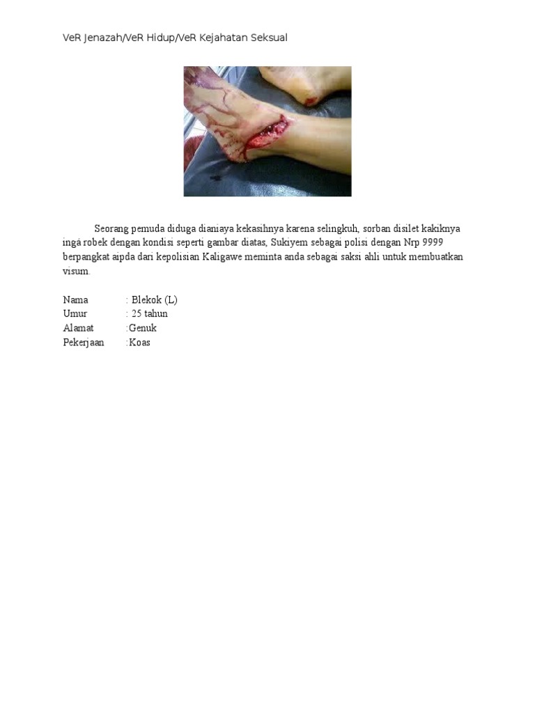 Tafsir Mimpi kaki Berdarah Atau Terluka- Menurut terjemahan dari buku erek erek mimpi ? arti yang tepat dari MimpiKaki Berdarah Atau Terlukaialah ada yang bermakna bagus atau ada juga yang mengartikan sebagai pertanda yang kurang baik berkaitan dengan urusan kesehatan anda. Ikuti langkah-langkah pertolongan pertama pada luka robek ini: 1. Tetap tenang. Saat ingin menolong orang yang mengalami luka robek, pastikan diri dalam keadaan tenang dan aman. Vulnus laceratum yang gawat seringkali mengucurkan darah yang deras. Pastikan darah tidak mengenai diri dan orang lain.